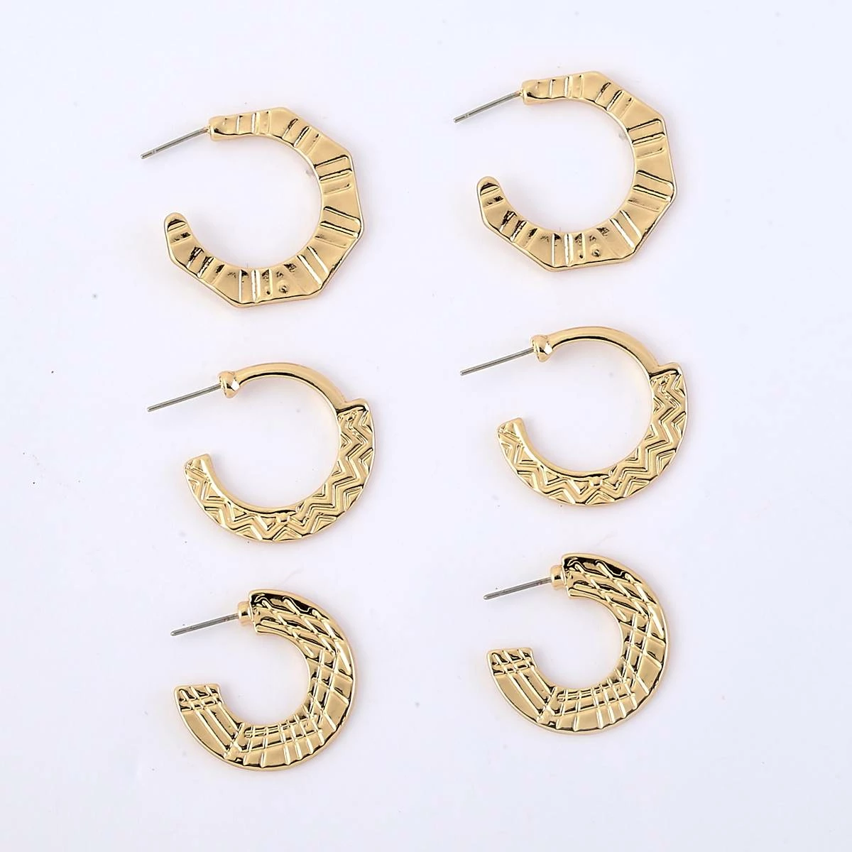 You will love the versatility of the 3 pairs of Ashley Cooper™ gold plated textured post hoop earrings.
