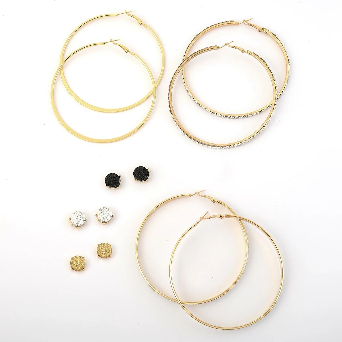 You will love the versatility of the Ashley Cooper™ 6-pair gold plated post and hoop earrings with jet, gold, and silver glitter paper.