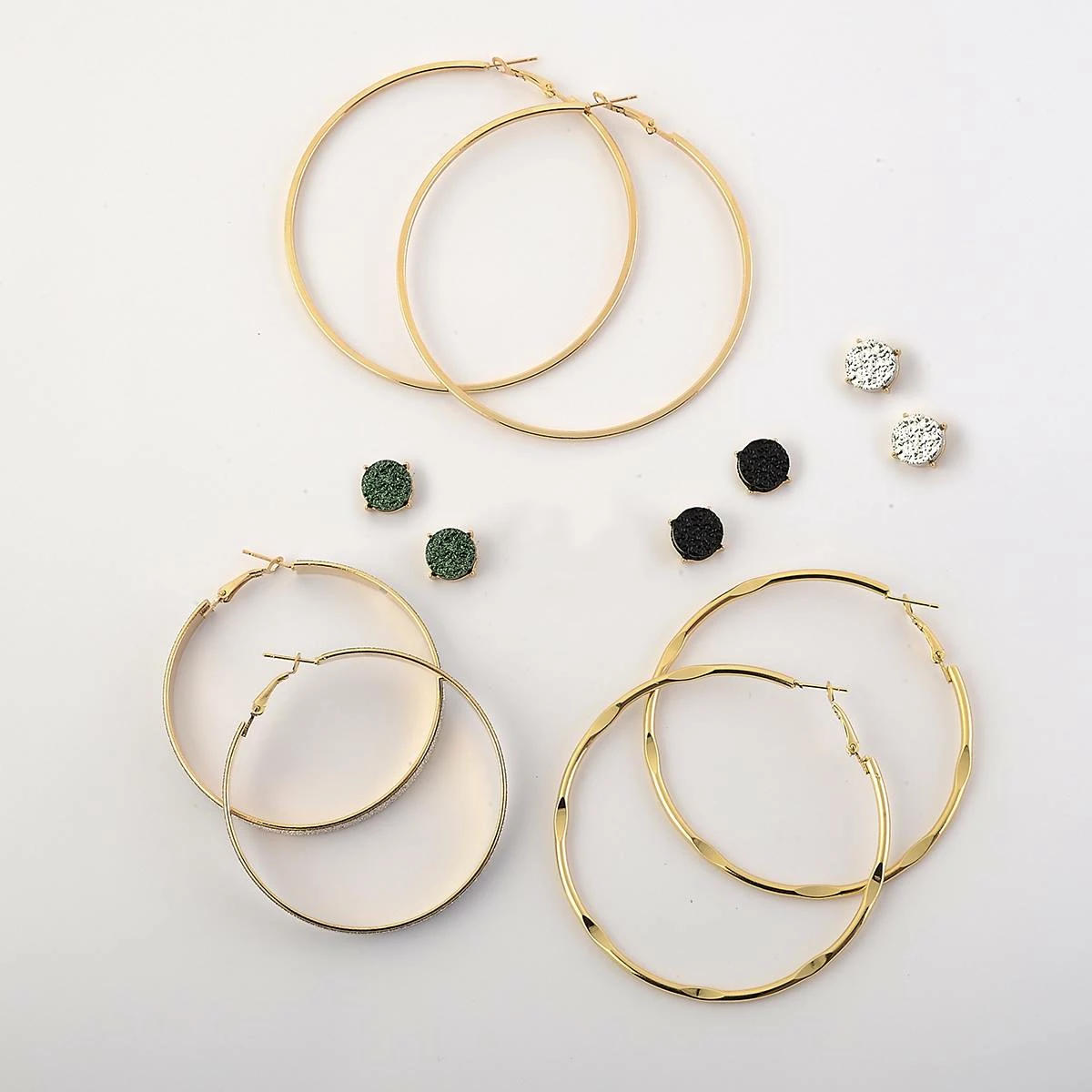 You will love the versatility of the Ashley Cooper™ 6-pair gold plated post and hoop earrings set with jet, green, and silver glitter paper.
