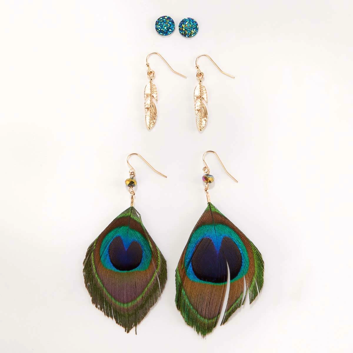 This Ashley Cooper™ gold boho trio earring set includes peacock feathers, and will make you stand out from the crowd.