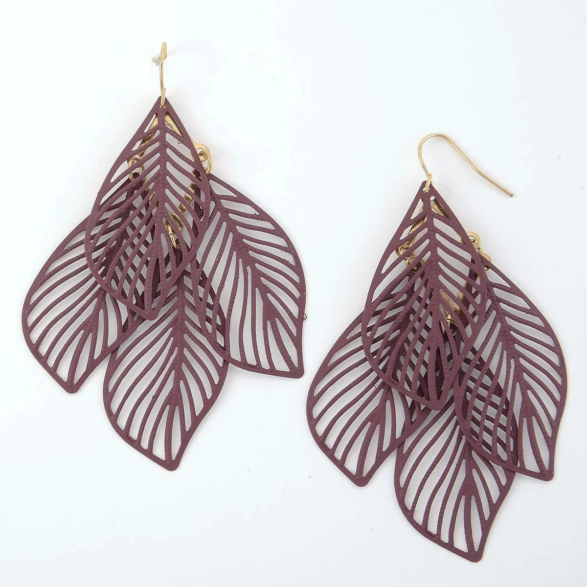 Accent your ensemble with the Ashley Cooper™ burgundy and gold filigree leaf cluster earrings.
