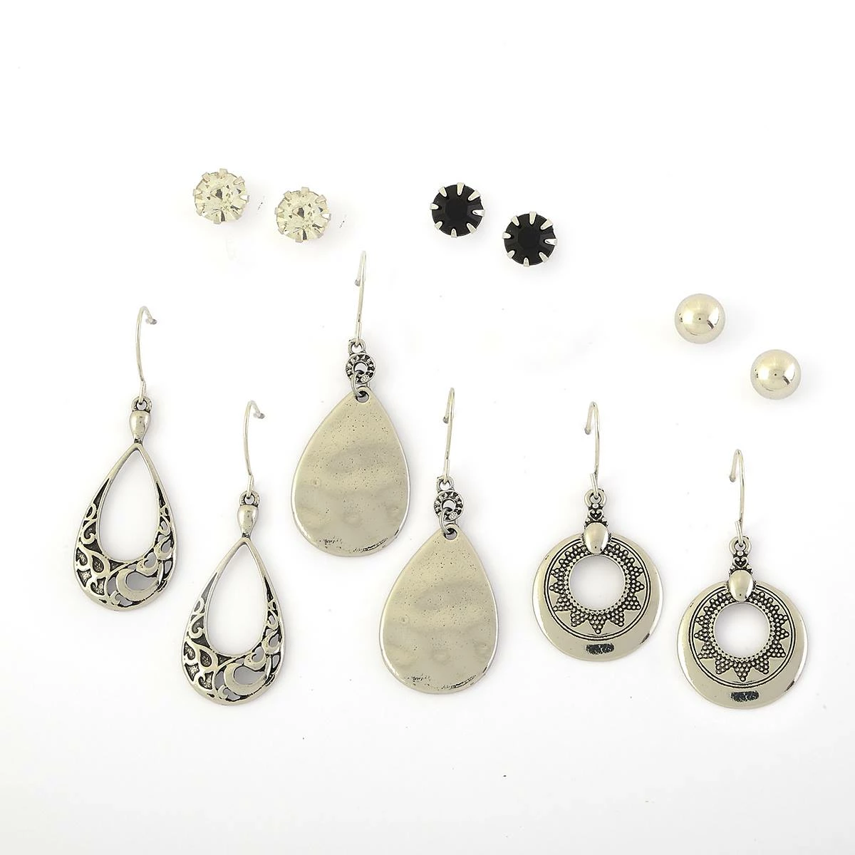 You’ll have the perfect pair for any occasion with this Ashley Cooper™ 6-pair silver plated crystal and jet stone post earrings set with filigree and hammered fish hook earrings.