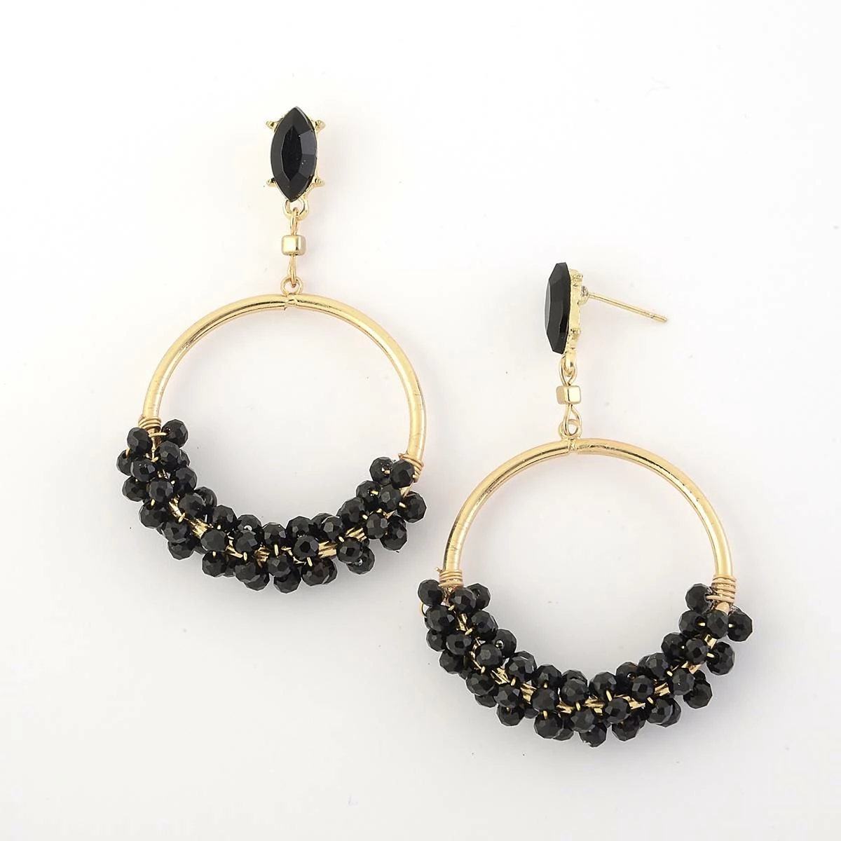 Make a statement with the fabulous Ashley Cooper™ gold plated post-top dangle earrings with hoops including jet glass and acrylic beads.