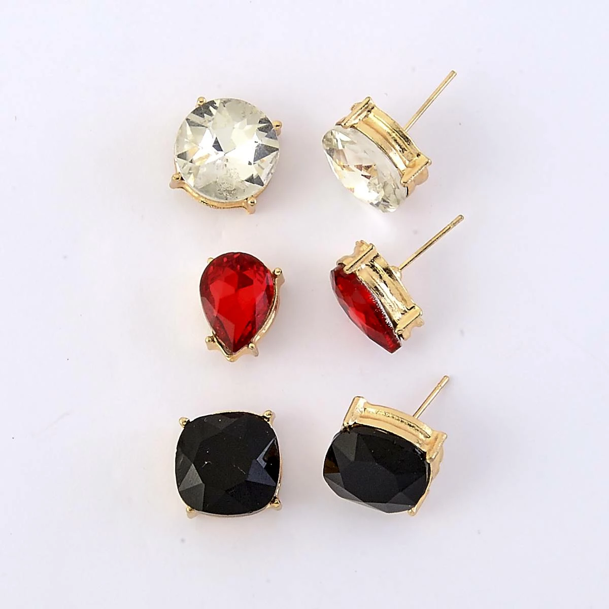 3 pairs of Ashley Cooper™ gold plated post earrings in a teardrop, round, and square shapes with red, crystal, and jet stones.