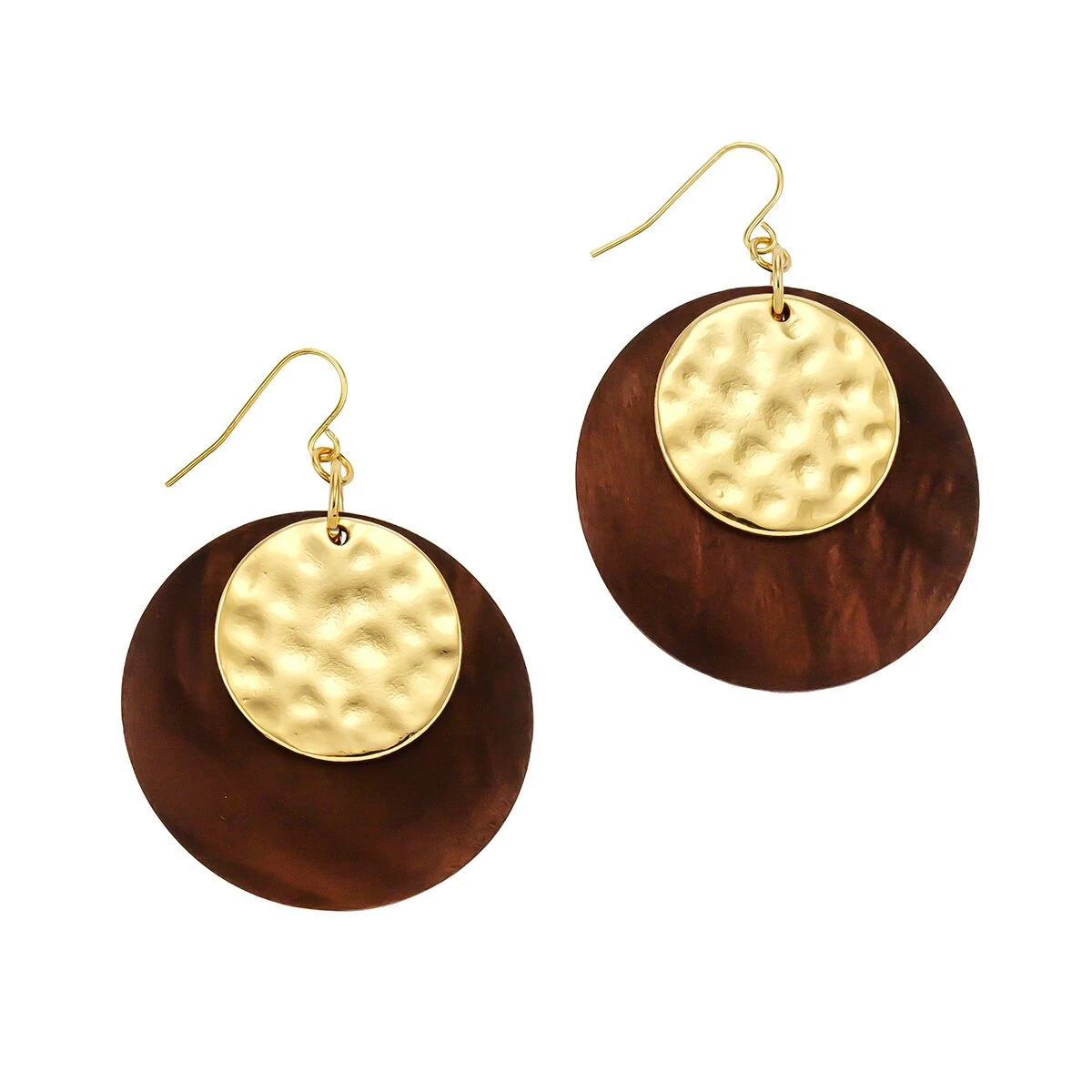 Natural elements accent the Ashley Cooper™ gold-tone layered hammered gold-tone metal and dark brown wood disc earrings on fish hooks.