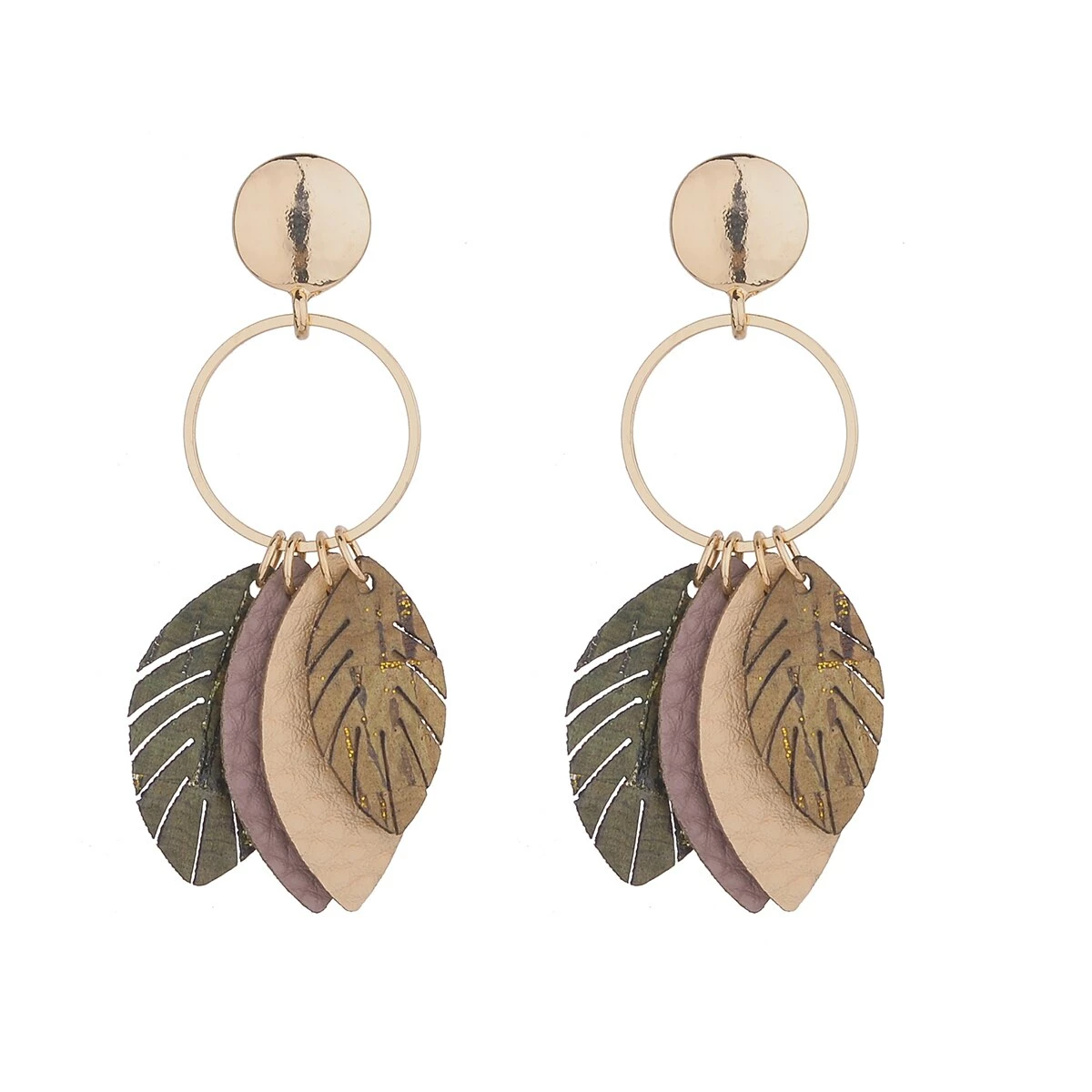 Accessorize your favorite looks with the Ashley Cooper™ olive, brown, and tan faux leather leaf earrings.