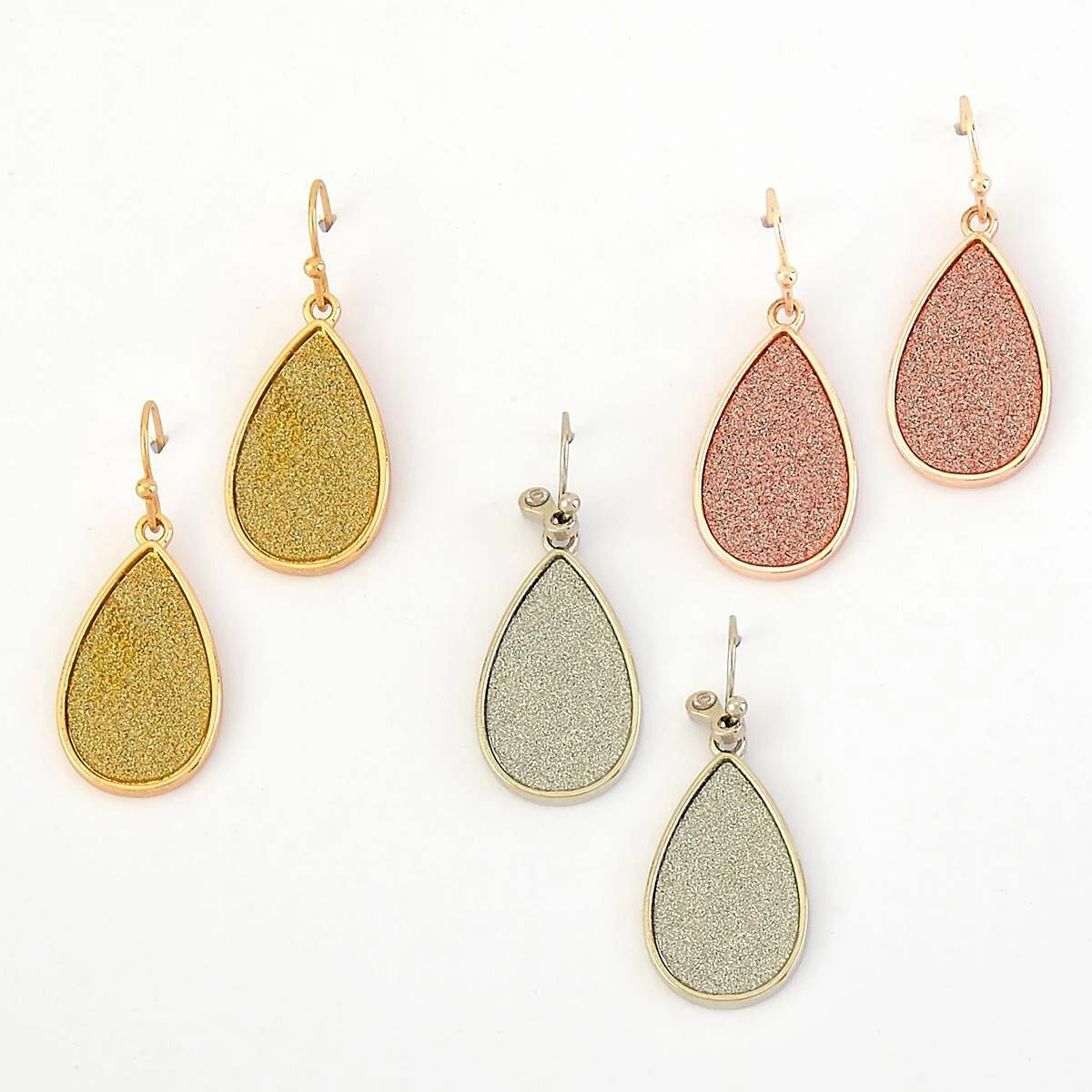 Add the perfect touch of sparkle for any occasion with this Ashley Cooper™ trio of sugar teardrop earrings in silver, gold, and pink.