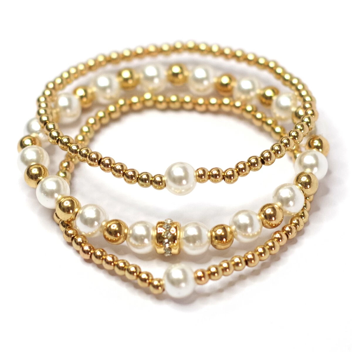 Lustrous gold beads and faux pearls make this Ashley Cooper™ 3-row stretch bracelet an easy choice day or night.