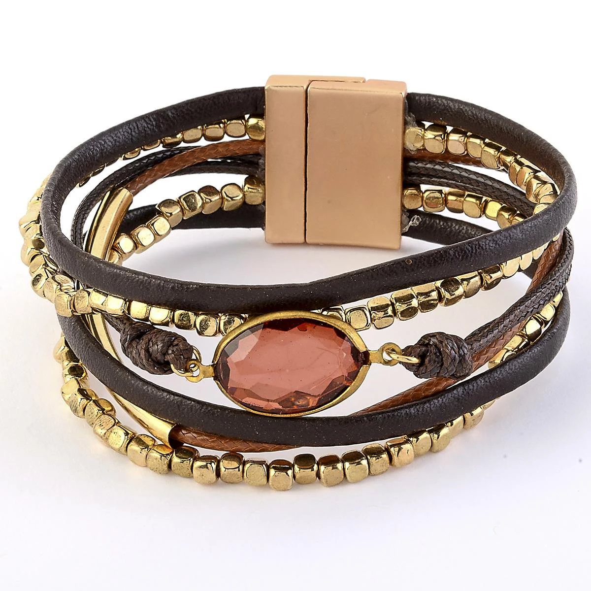 Show off your style with the Ashley Cooper™ 6-row gold plated magnetic closure bracelet with brown cords, gold beads, and larger faceted brown beads.