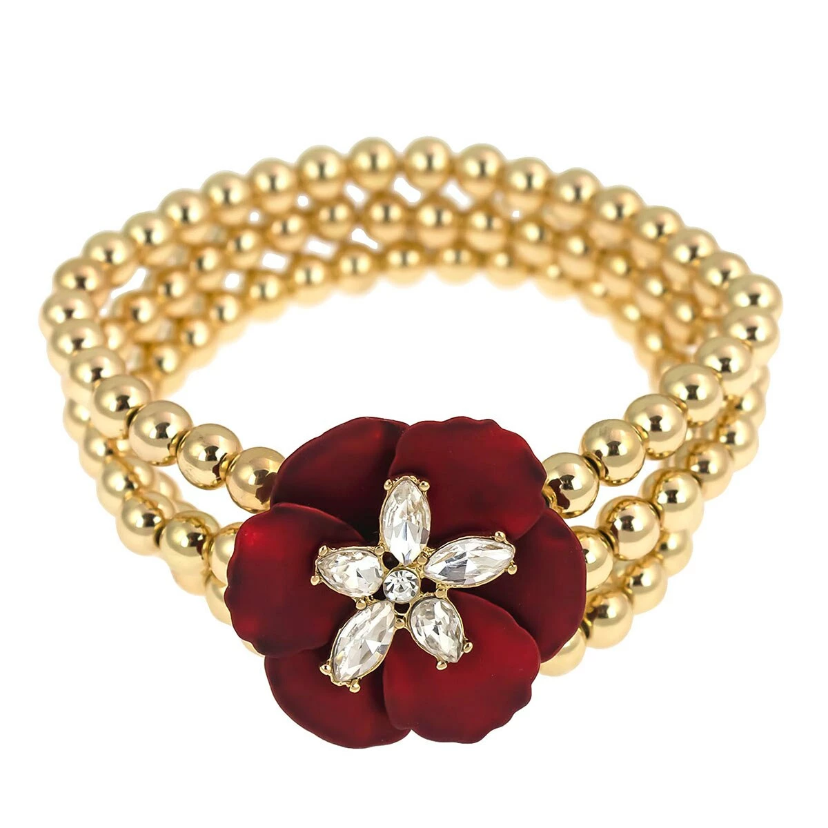 Add a chic finish to your ensemble with the charming Ashley Cooper™ gold-tone 3-row beaded stretch bracelet and red enamel flower with a center crystal stone.