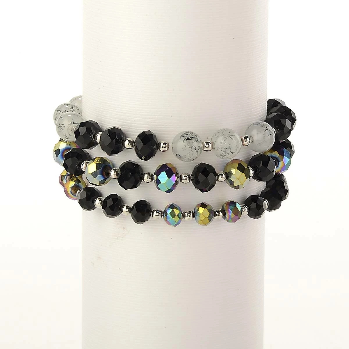 The Ashley Cooper™ 3-piece stretch bracelet set features grey smooth marbleized beads and faceted jet AB beads.