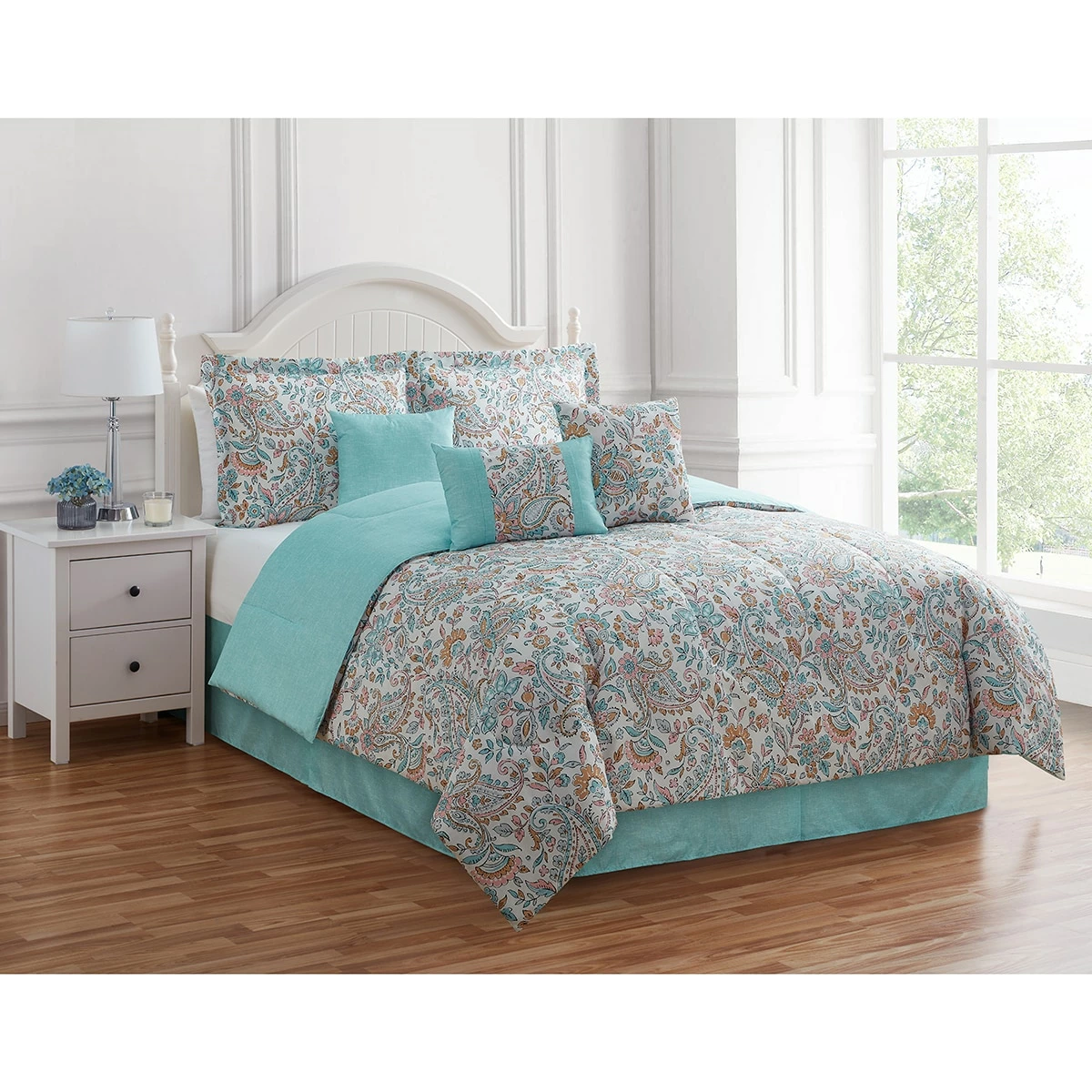 This Ashley Cooper™ 7-piece Priscilla paisley comforter set includes everything you need to create the bedding ensemble of your dreams. The comforter features a beautiful paisley print in blue, tan, and pink shades on a white background that reverses to a marled pattern, making for a striking and easy-to-switch-up look that’s perfect for any bedroom decor.Includes comforter, sham(s), bed skirt, and 3 decorative pillows.