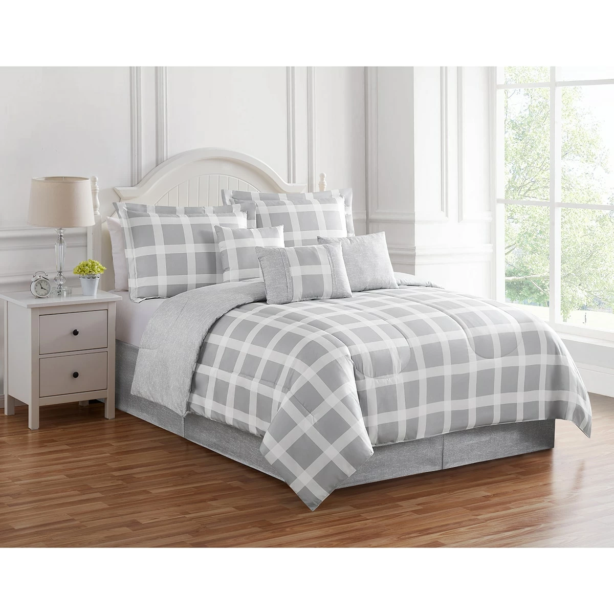 Neutrals go up a notch in this Ashley Cooper™ 7-piece simple plaid comforter set. The comforter boasts a large-scale gray and white plaid print and if you need a change the understated marled pattern reverse gives you just that!Set includes comforter, sham(s), bedskirt, and 3 decorative pillows.
