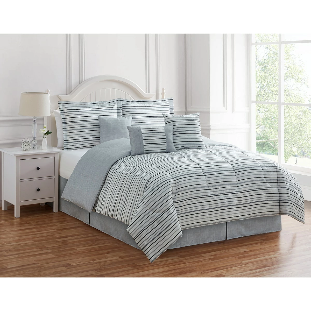 This Ashley Cooper™ 7-piece textured stripe microfiber comforter set offers a chic casual comfort to your bedroom. The comforter features a modern striped pattern that has a ruched and yarn-dyed look to create dimension for a contemporary style. A marled pattern reverse pairs handsomely with the top of the bed.