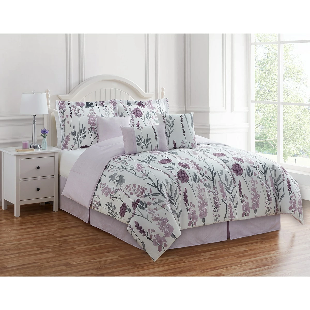 Revamp your sleep space into a fashionable relaxing retreat with this Ashley Cooper™ 7-piece Vivienne reversible comforter set. The earthy natural shades of green and purple will set your bedroom up in high style.Includes comforter, sham(s), bed skirt, and 3 decorative pillows.