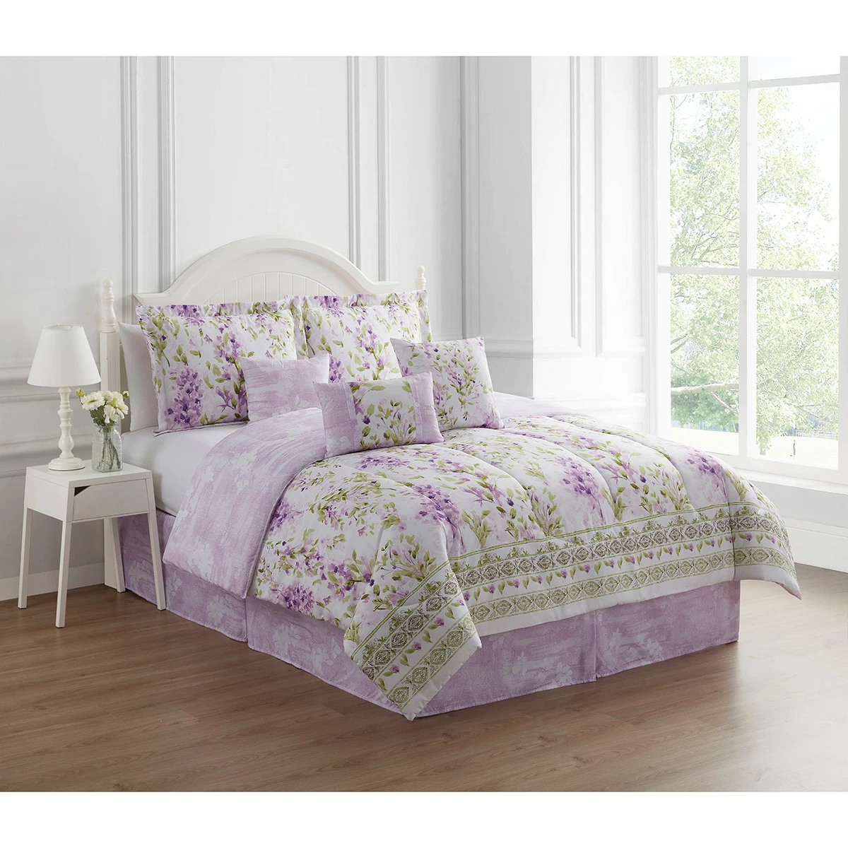 - Set includes (1) comforter, (2) shams, (1) bed skirt, and (3) decorative pillows