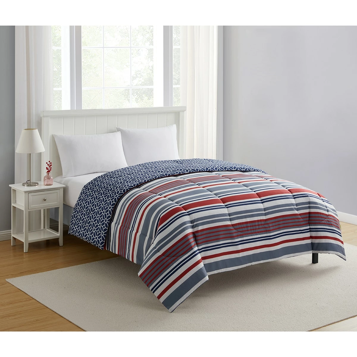 Give your bedroom a contemporary casual-chic look with this Ashley Cooper™ irregular stripe micro print reversible comforter. The cozy bedding features a modern stripe pattern and reverses to a geometric print.
