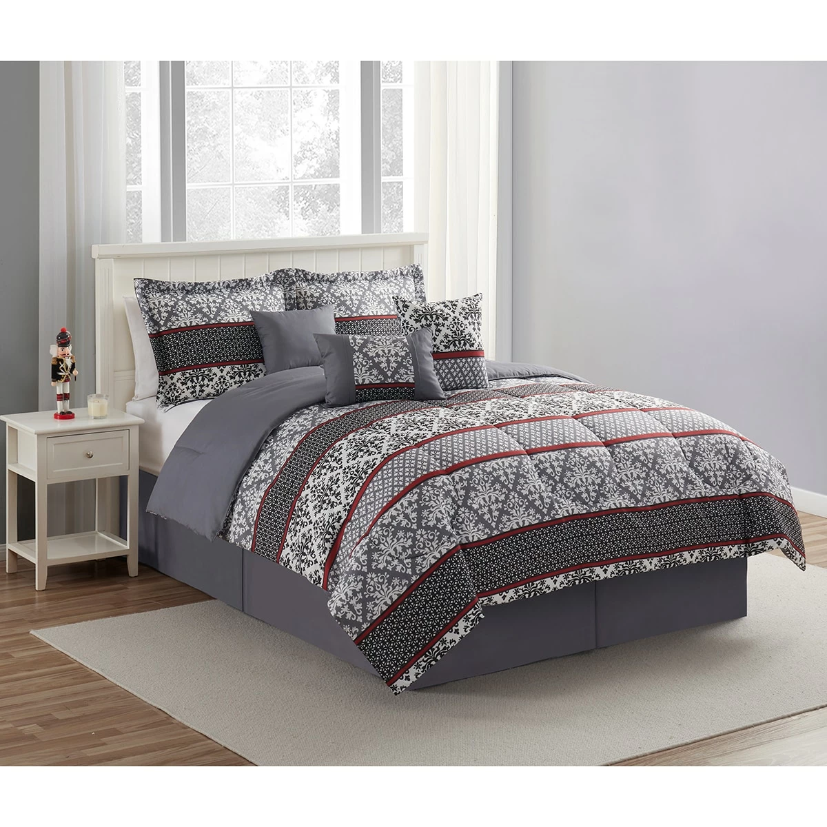 Enjoy a regal feel in your bedroom with this Ashley Cooper™ Kenza 7-piece reversible comforter set. Featuring an ornate damask pattern in rich grey and black with a dash of maroon creating a striking gorgeous contrast. The matching shams echo the bold and stylish design of the comforter. This comforter set will transform your bedroom into a stunning and lavish retreat!