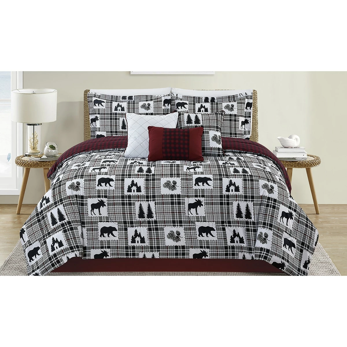 Lodge-inspired panels of wildlife adorn this Ashley Cooper™ Mountain patch 7 piece comforter set.Set includes comforter, sham(s), bedskirt, and 3 decorative pillows.
