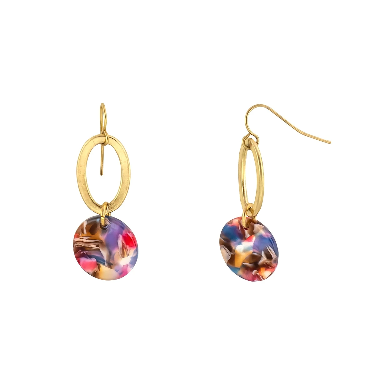 The Ashley Cooper™ gold-tone open oval link with round multi color lucite disc drop earrings on fish hooks are modern and captivating.