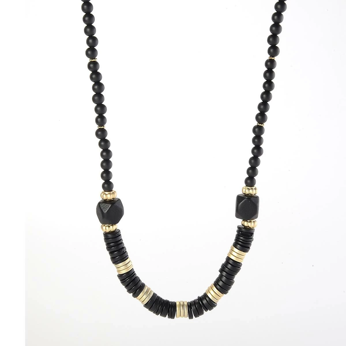 Add a chic finish to your ensemble with the charming Ashley Cooper™ gold plated wood beaded necklace with gold discs and jet facetted and round beads.
