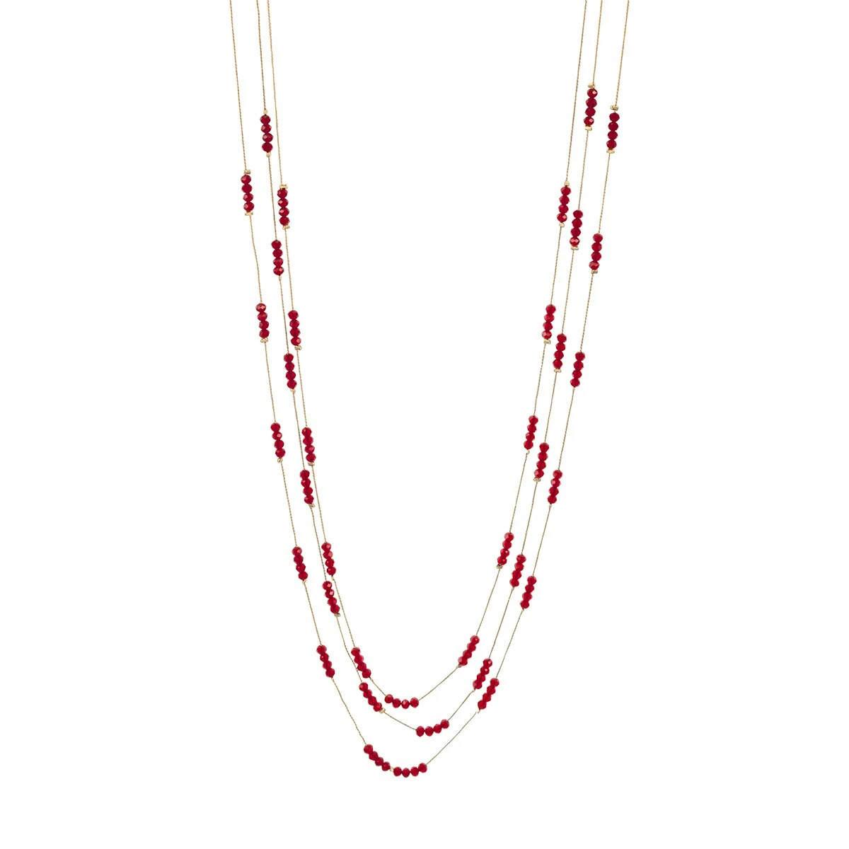 Ashley Cooper™ layered long 3 row necklace with red bead stations. The necklace measures 36 inches with a 3-inch extender and is dazzling and sophisticated.