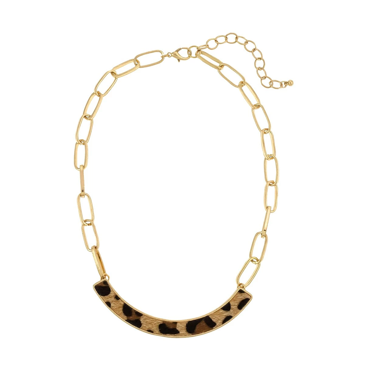 Show off your style with the Ashley Cooper™ gold-tone leopard print frontal bar necklace with chain link back.
