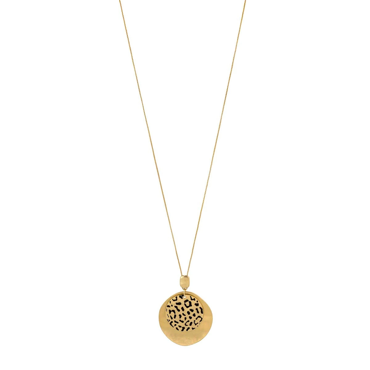 You’ll want to show off this spectacular Ashley Cooper™ gold-tone long leopard metal disc pendant necklace. The necklace measures 40-inches in length with a 3-inch extender.