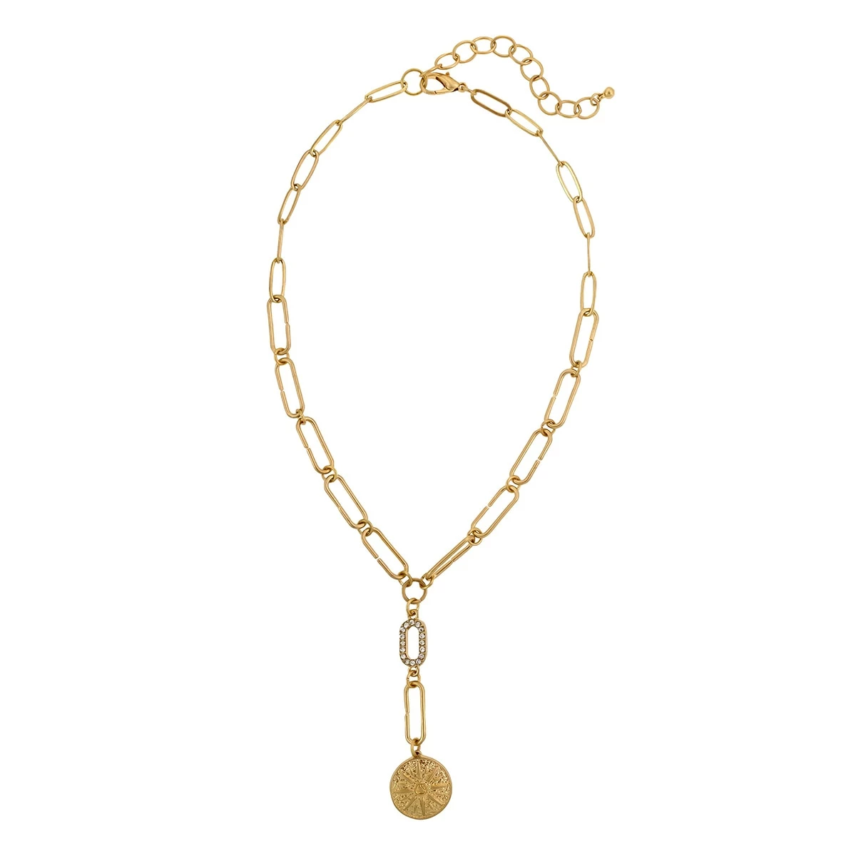 You are sure to adore the stylish look of the Ashley Cooper™ gold-tone open chain link y-necklace with crystal coin drop. The necklace measures 18 inches with a 3-extender.