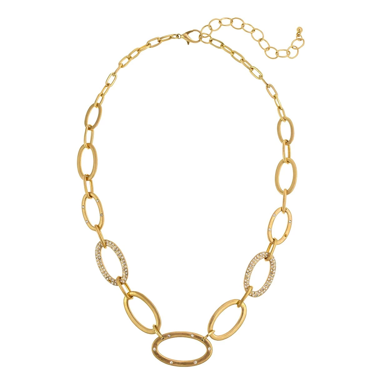 Elevate your look with the Ashley Cooper™ gold-tone short graduated open-link necklace with crystal stone accents. The necklace measures 18 inches with a 3-inch extender.