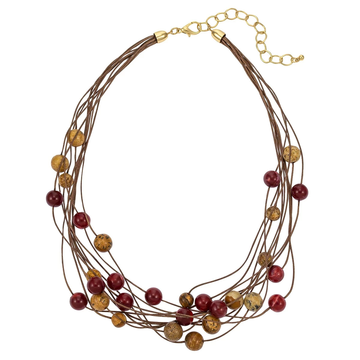 The Ashley Cooper™ gold-tone short multi-row corded necklace features berry and neutral bead stations. The necklace measures 18 inches with a 3-inch extender.