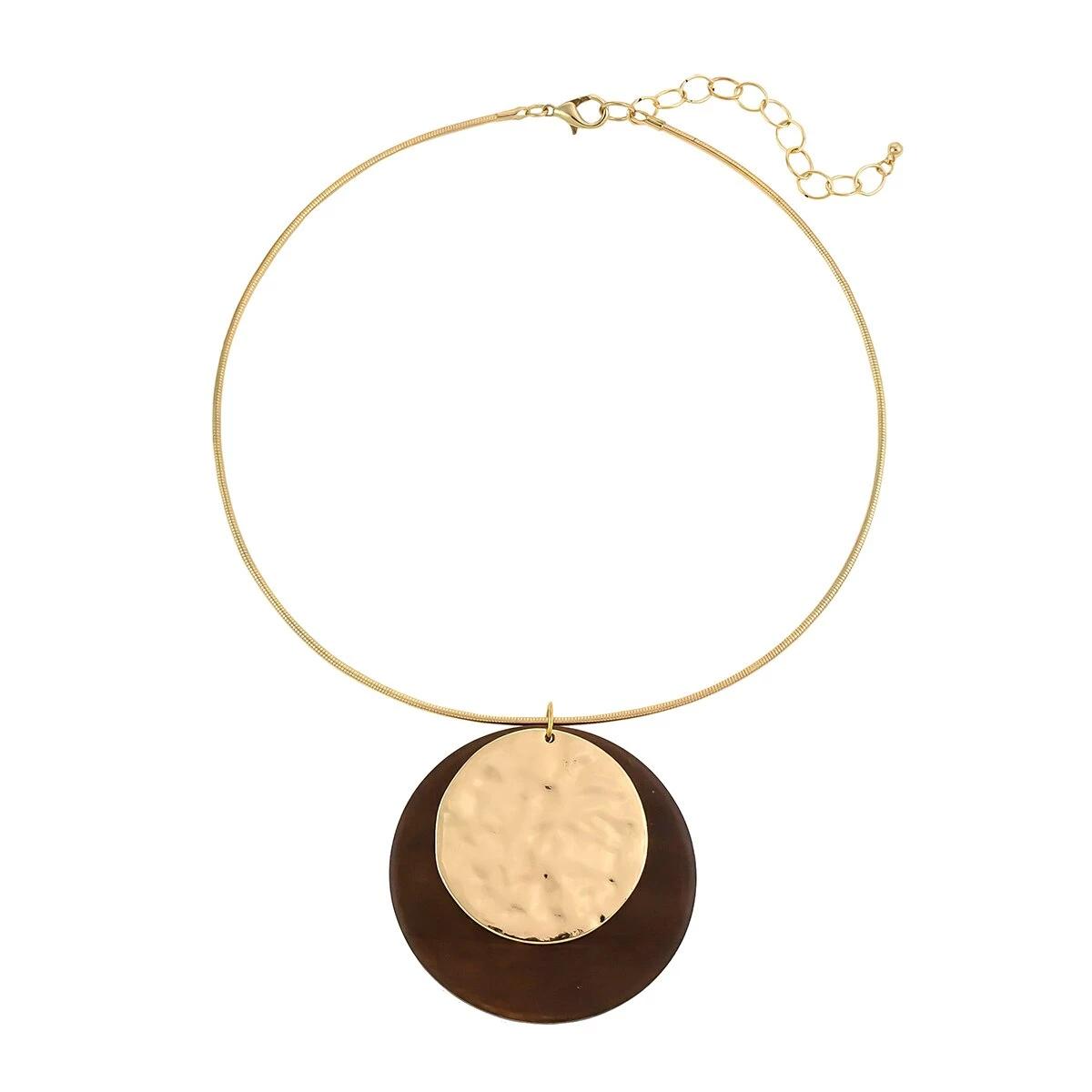 Accent your ensemble with the Ashley Cooper™ neck wire with layered hammered gold-tone and dark brown wood disc pendant drop necklace.