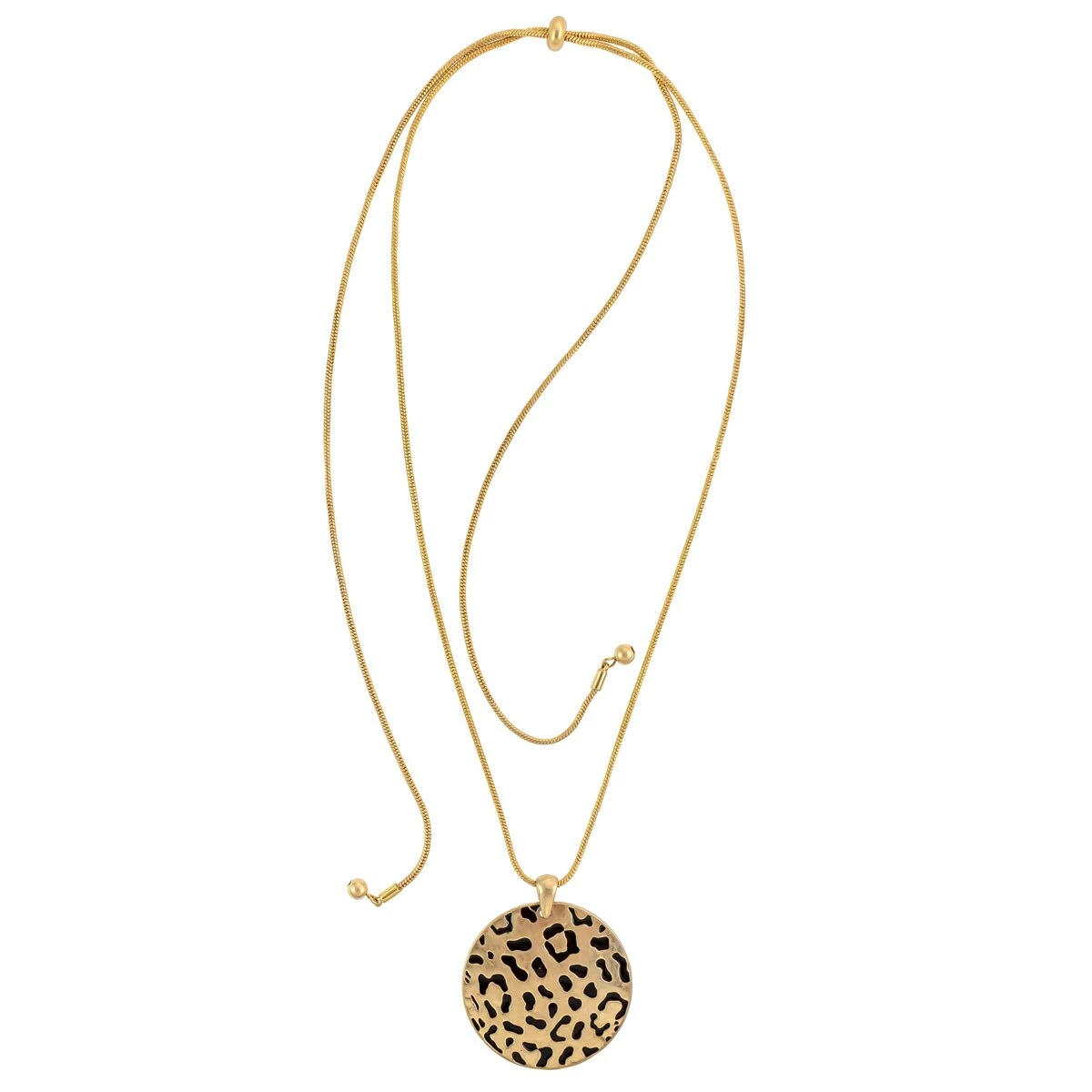 You’ll look stunning wearing this Ashley Cooper™ gold-tone leopard print round pendant on a snake chain necklace. The necklace measures 36-inches with a 3-inch extender.
