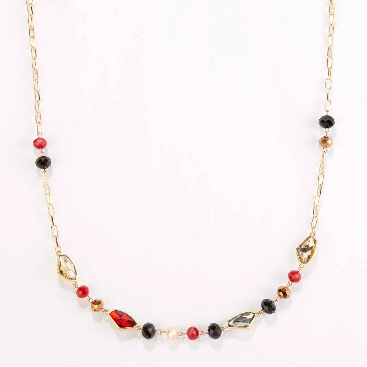 Add a pop of color to your look with the Ashley Cooper™ red, black, and champagne color short beaded necklace.