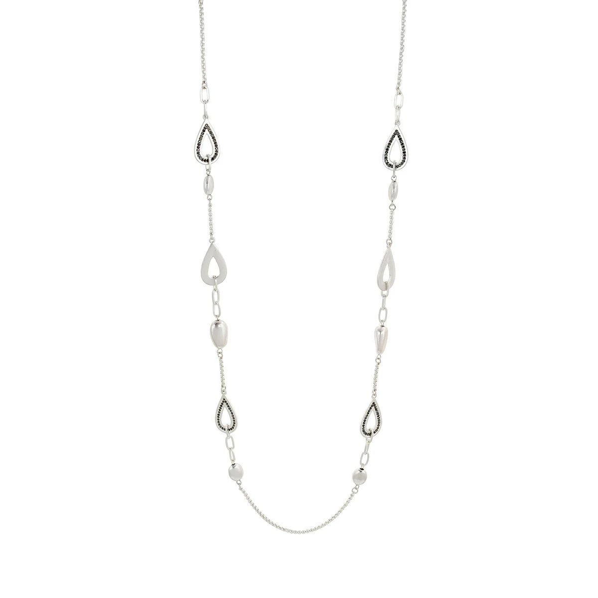 The trendy Ashley Cooper silver-tone long chain linked necklace features bead and teardrop stations and hematite stone accents. The necklace measures 36 inches with a 3-inch extender.