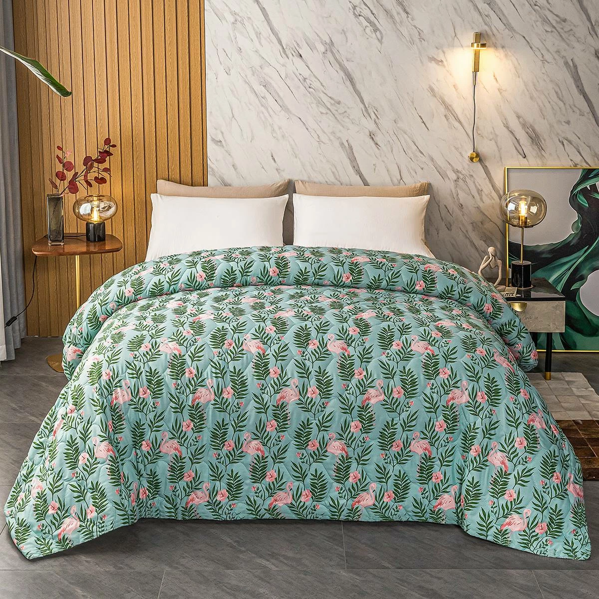 Transport your bedroom to the tropics with this Ashley Cooper™ Montego Bay print quilt. The green leaf and pink flamingo patterns contrast nicely on a turquoise background.