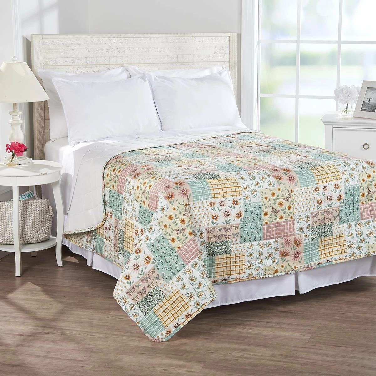 Bring on the boho vibes with this Ashley Cooper™ spring patchwork printed quilt. Made from polyester, the classic style features whimsical floral-inspired prints and splashes of color that liven up any room.