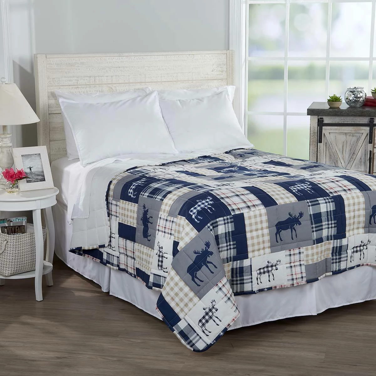 Rekindle memories of that cabin in the woods with this Ashley Cooper™ wander print quilt. The quilt features a patchwork-like design of moose images and plaid.