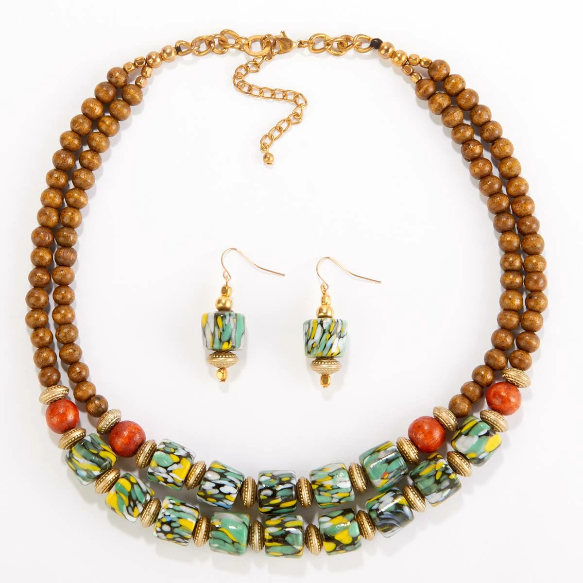 The Ashley Cooper™ 2-row gold plated necklace is created of wood and matrix beads with matching earrings. The necklace measures 18-inches with a 3-inch extender.