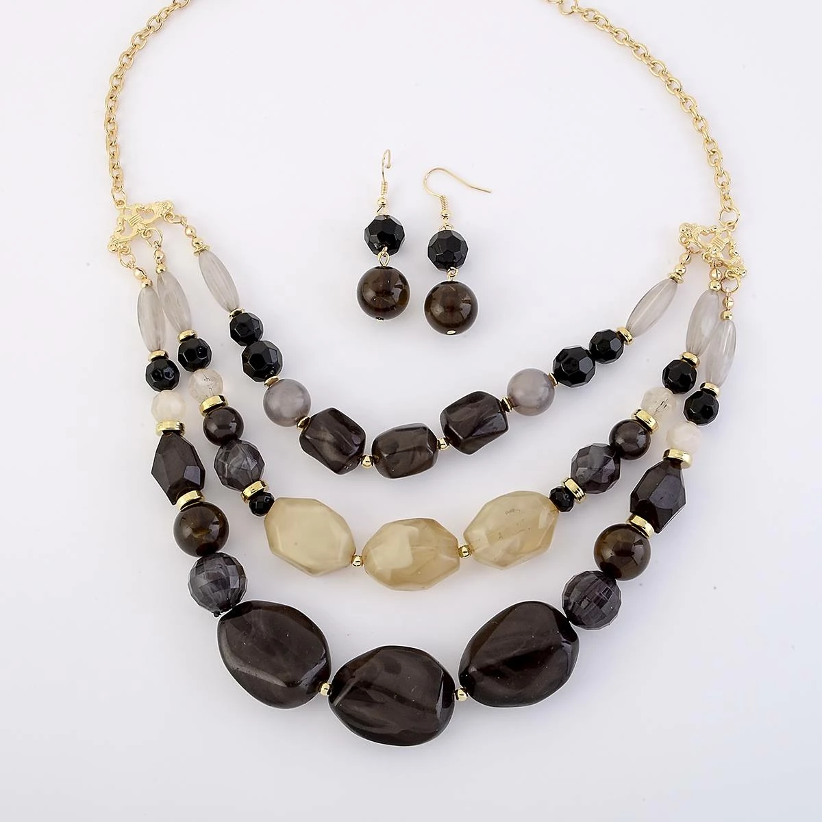 Step out in eye-catching style when you wear the Ashley Cooper™ gold plated 3-row necklace with marble jet and grey beads and matching fish hook earrings.