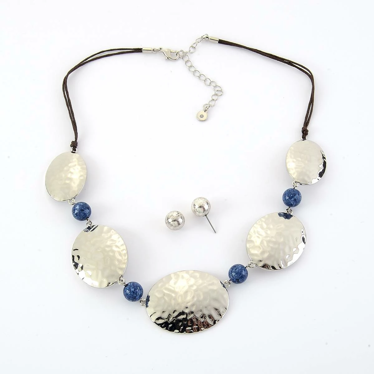 The Ashley Cooper™ statement necklace and earrings set features a blue bead and hammered silver disc necklace with silver ball earrings.