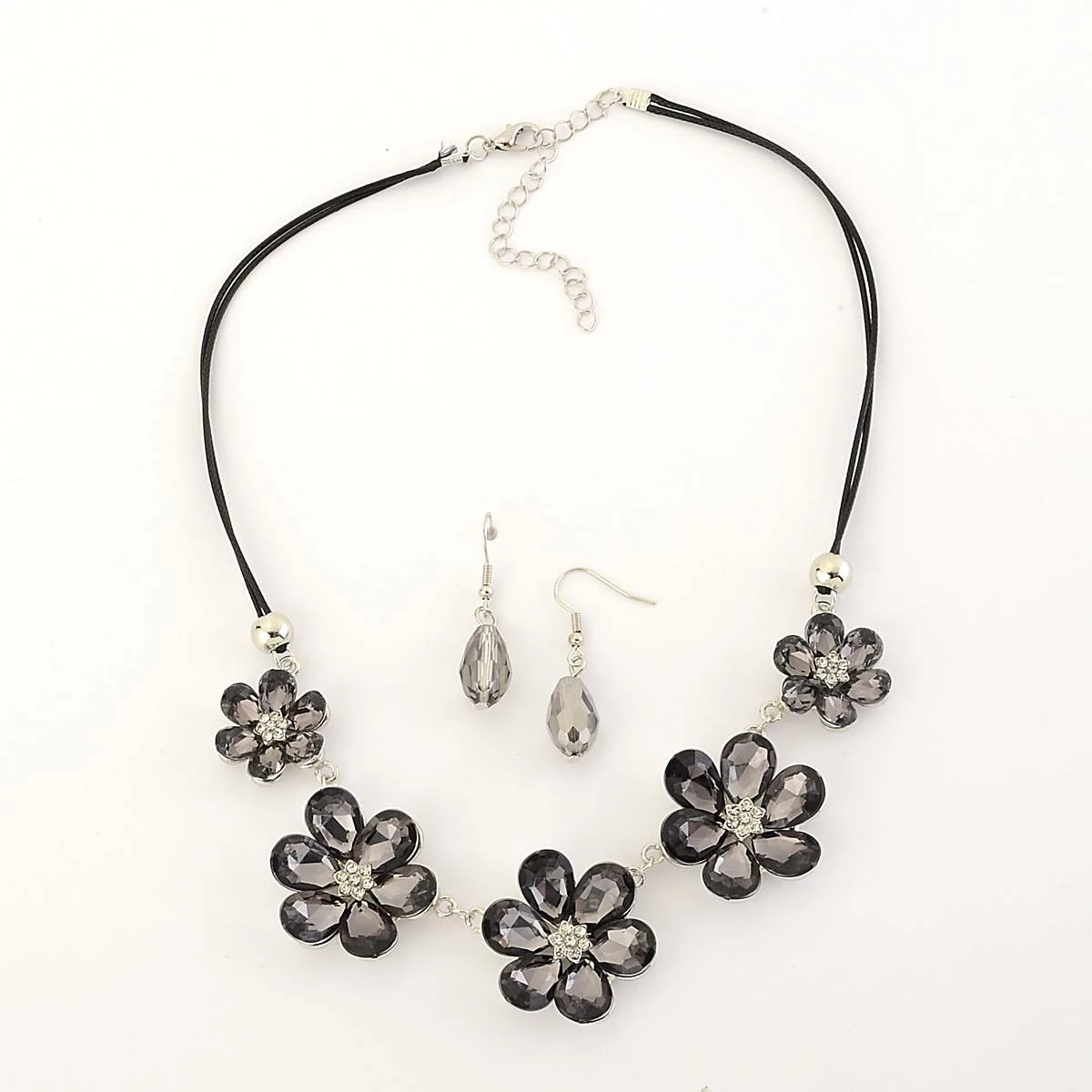 Step out in eye-catching style when you wear the Ashley Cooper™ silver plated polyurethane corded flower necklace with glass stones and teardrop fish hook earrings.
