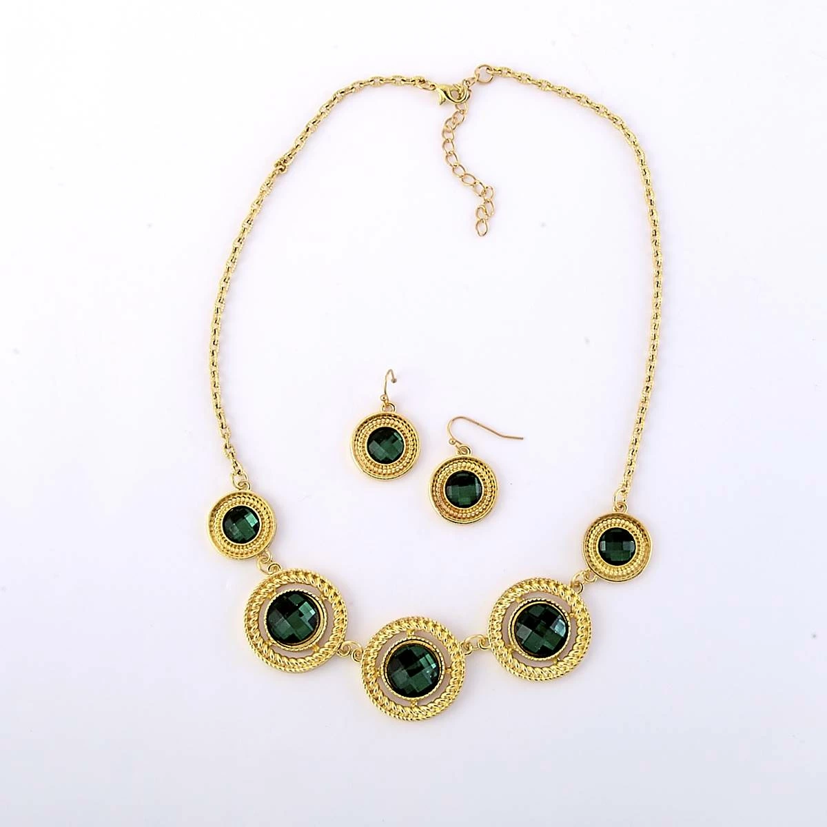 Add some sparkle to your day with the Ashley Cooper™ gold plated chain necklace with casted circle cabs and acrylic emerald stones with matching fish hook earrings.