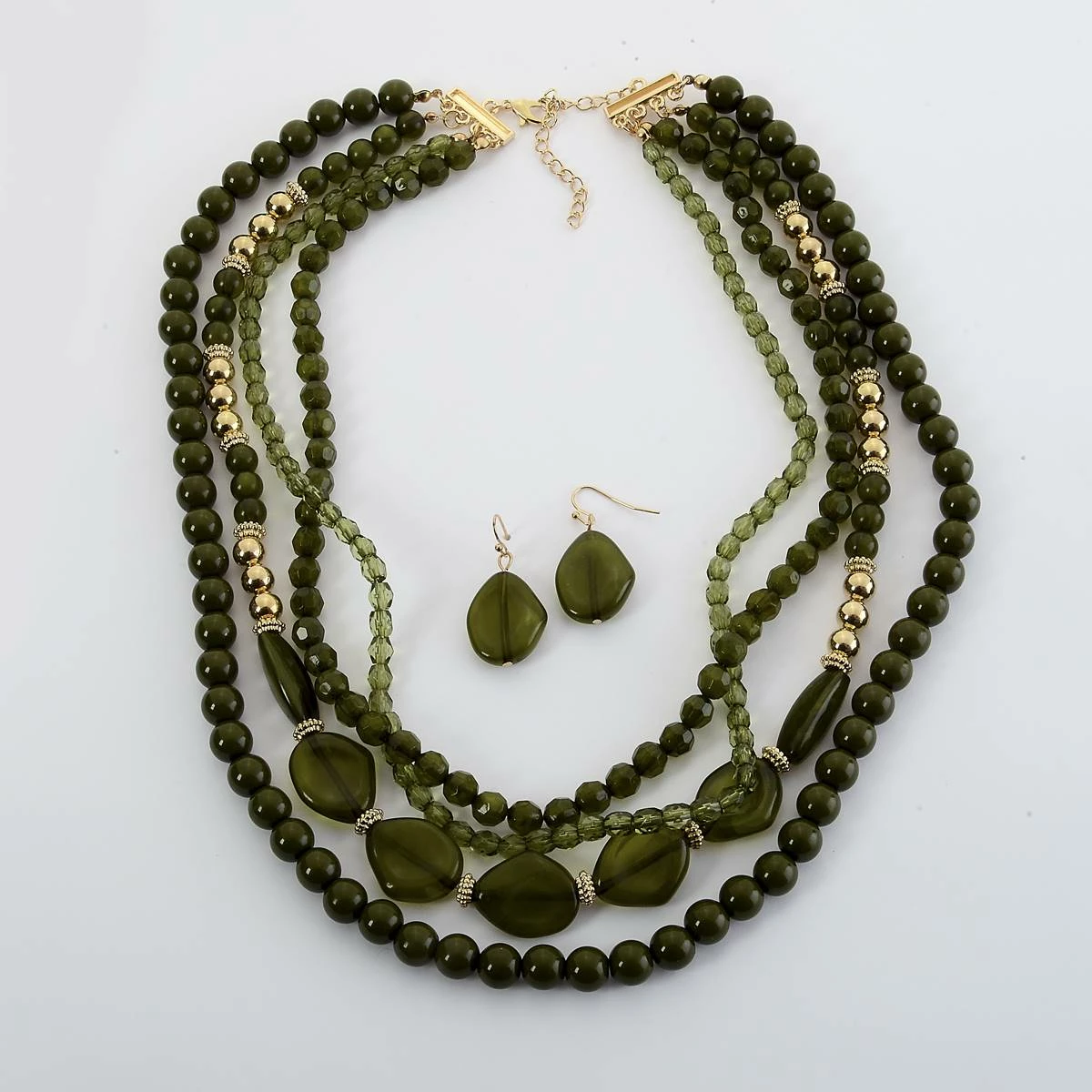 You’ll look stunning wearing this Ashley Cooper™ four-row beaded necklace with olive multi-shaped marble and faceted beads with matching olive fish hook earrings.