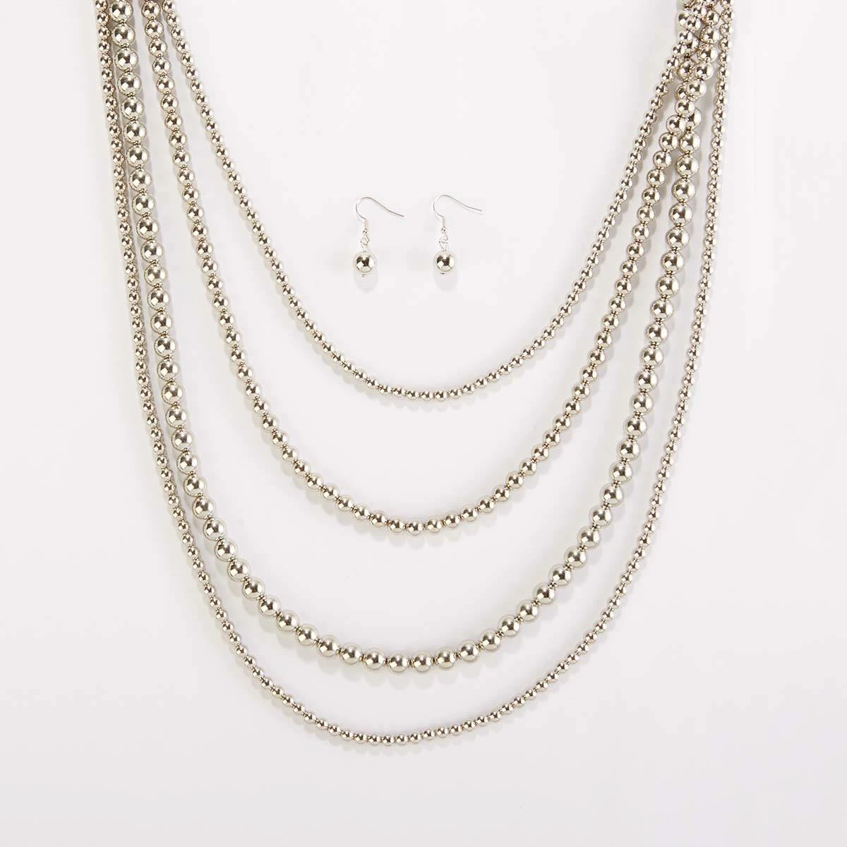 The Ashley Cooper™ four row gumball silver necklace and fishhook earrings set will soon become a staple in your wardrobe.