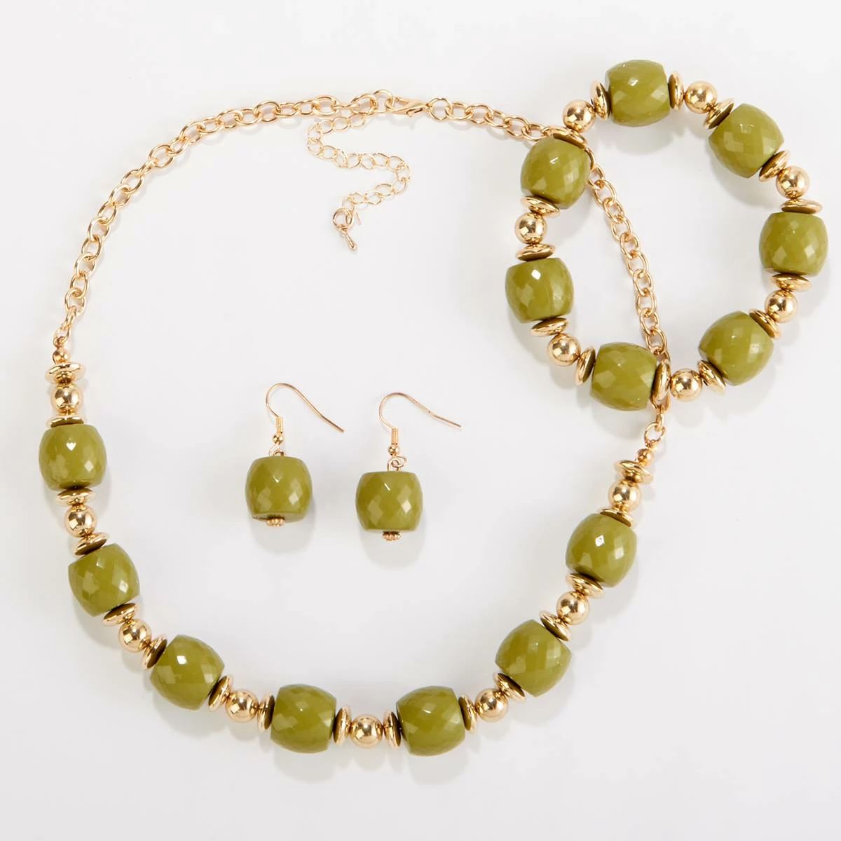 The Ashley Cooper™ Gold plated chain necklace features olive faceted beads with a matching bracelet and earrings. Measuring 18″ + 3″ extender.