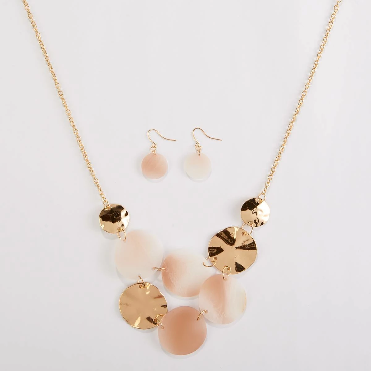 The Ashley Cooper™ gold plated cable chain necklace is designed with shell and dented disks in tan and brown with matching earrings. The necklace measures 18-inches with a 3-inch extender.