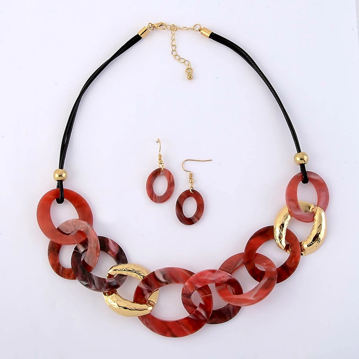 You will love the bold and beautiful Ashley Cooper™ gold plated marble acrylic and hammered tonal fuchsia interlocking rings with matching fish hook earrings.