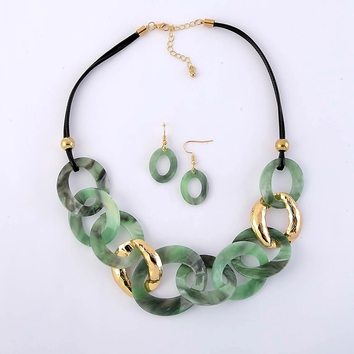 ou will love the beautiful Ashley Cooper™ gold plated marble acrylic and hammered tonal green interlocking rings with matching fish hook earrings.