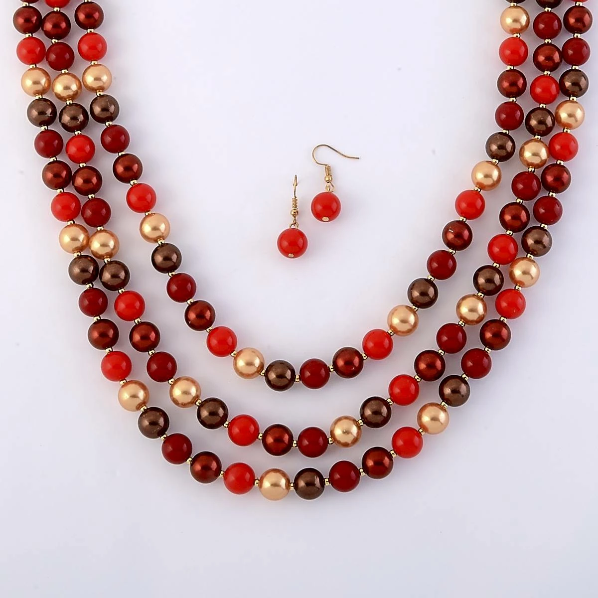 Add a pop of color to your look with the Ashley Cooper™ 3 row gold plated necklace with red, burgundy, and light gold acrylic beads and matching fish hook earrings.